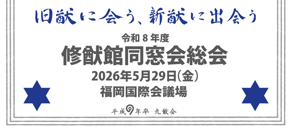 令和8年度修猷館同窓会総会の幹事学年を務めます平成9年卒・九猷会です。温かいつながりが生まれるひとときになるよう私ども平成9年卒業・九猷会一同、心を込めて準備をおこなって参ります。